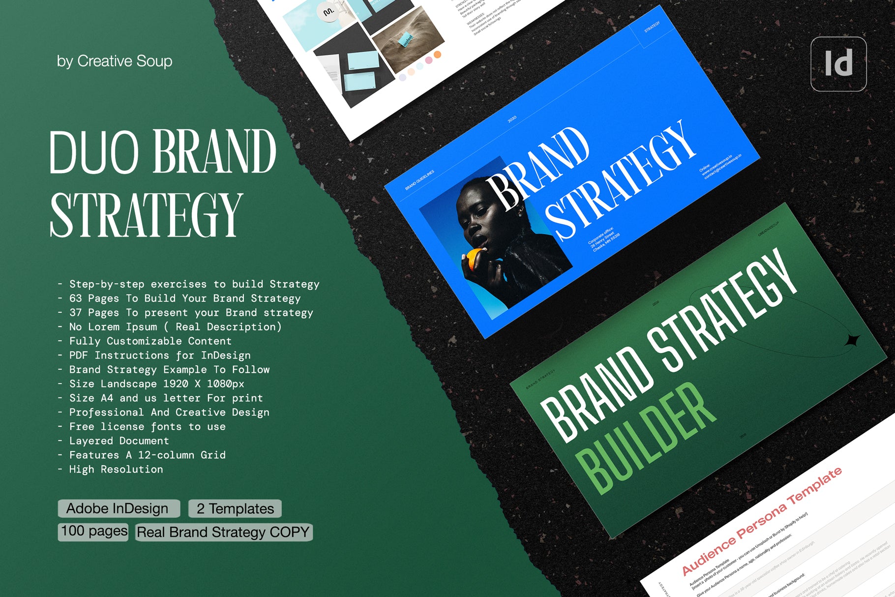 Duo-Brand Strategy is a ready-to-use template that works perfectly in Adobe Indesign. With this template, all you need to do is open the first template and follow the step-by-step exercises To Build your Brand Strategy. then present it on the second template.
