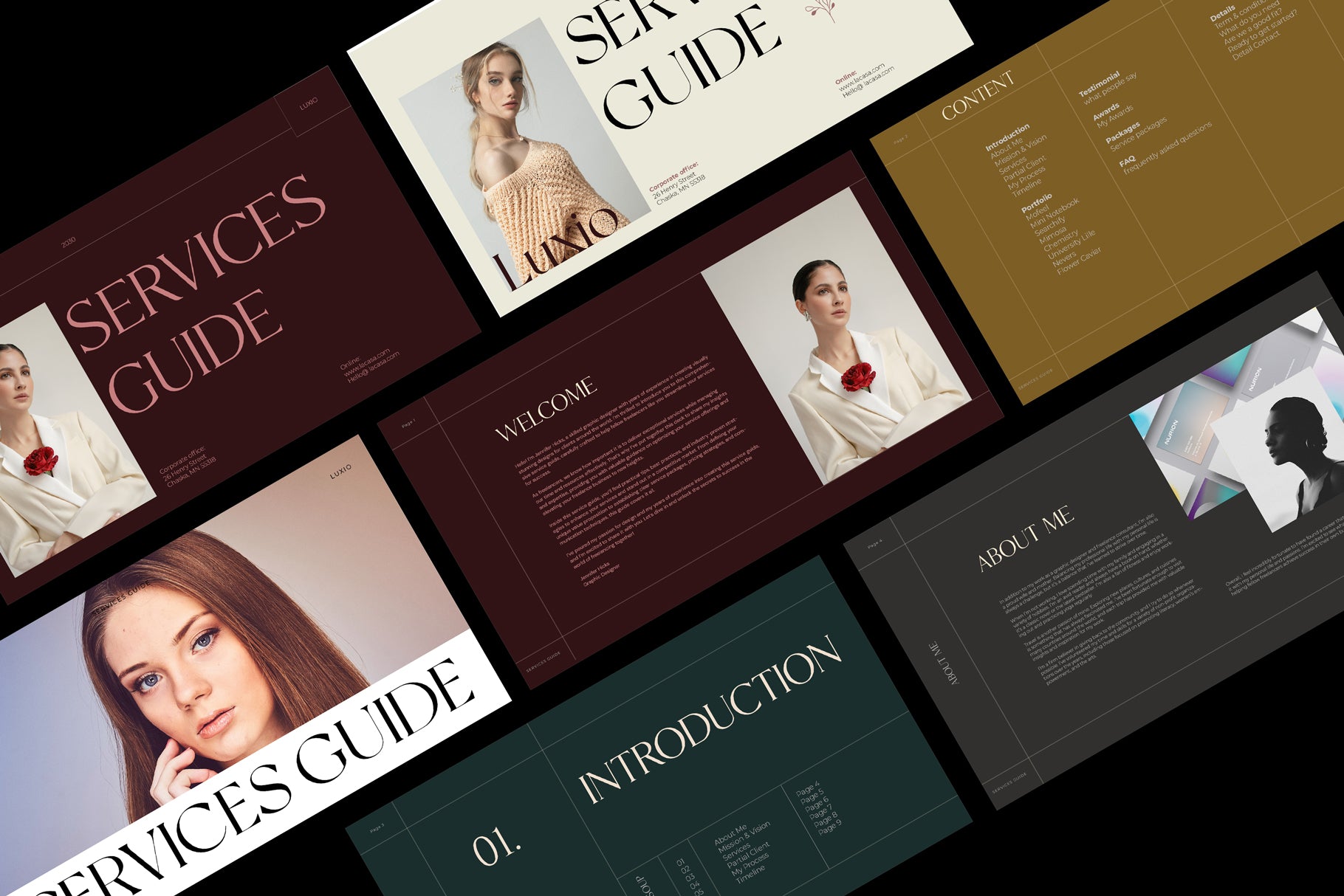 Luxio Services Guide for Graphic Design and web design Freelancers, complete with a bonus Freelance Toolkit! With 49 pages and 7 sections, this template is the perfect tool for any graphic designer looking to showcase their skills and services to potential clients. This Template works perfectly in Adobe Indesign, Adobe Illustrator, Google Slides, and Powerpoint.